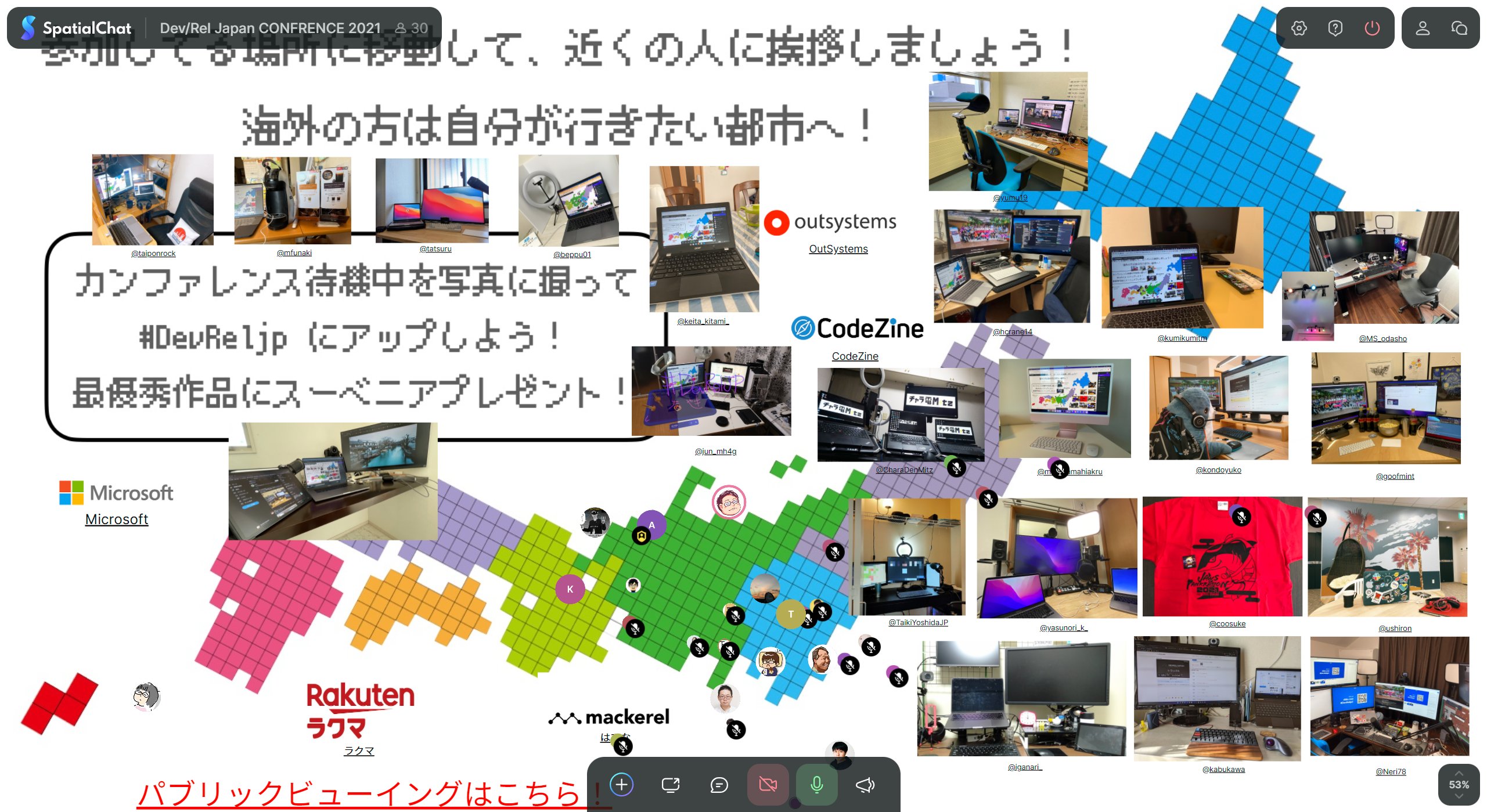 本セッション開始前のプレイベントで利用しました。会場全体に日本地図を配置しています。自分が参加している地域に移動して、その近くにいる人たちと話してもらえるように促しています。また、同時に視聴準備が整った環境を写真に撮ってTwitterに流してもらい、それをSpacial Chat上に貼り付けています。思いのほか投稿が集まったので、日本地図が見えづらくなっています。
